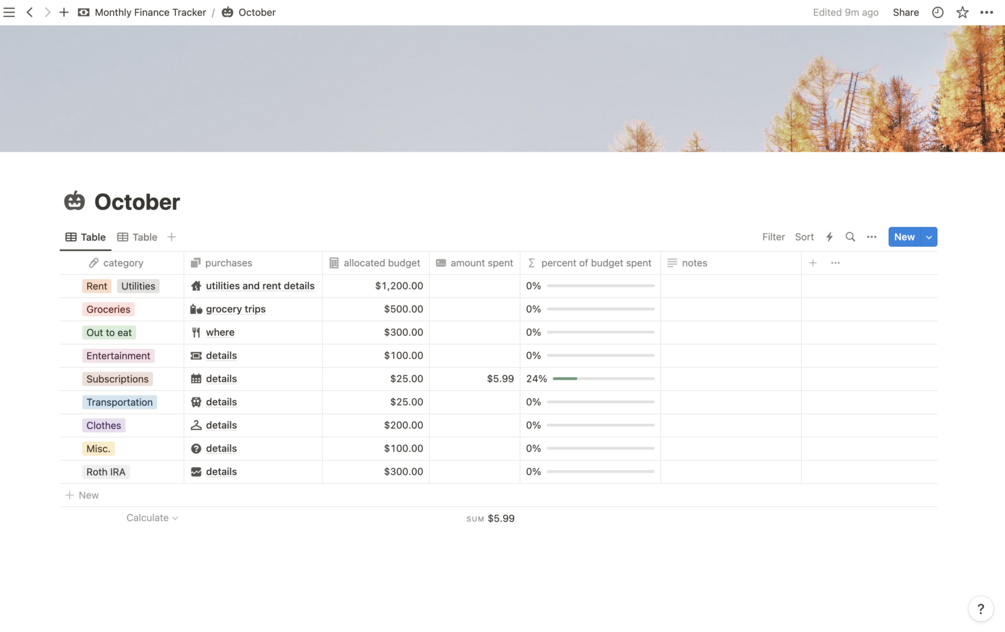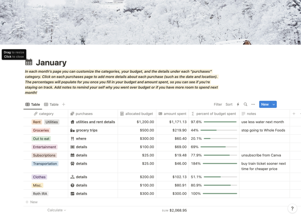 This Notion template is perfect to make sure you’re staying within your budget and track exactly what you’re spending your money on each month. This template is separated by month and you can customize it to track different categories and include all the details of the purchase (date, location, price).